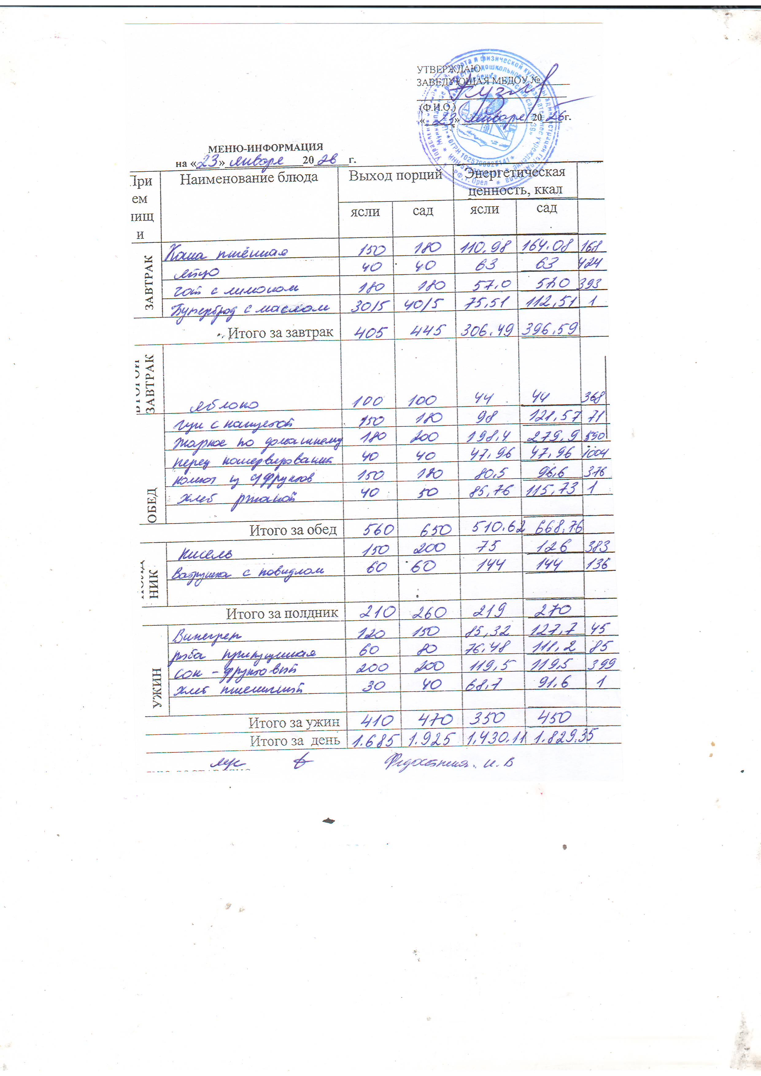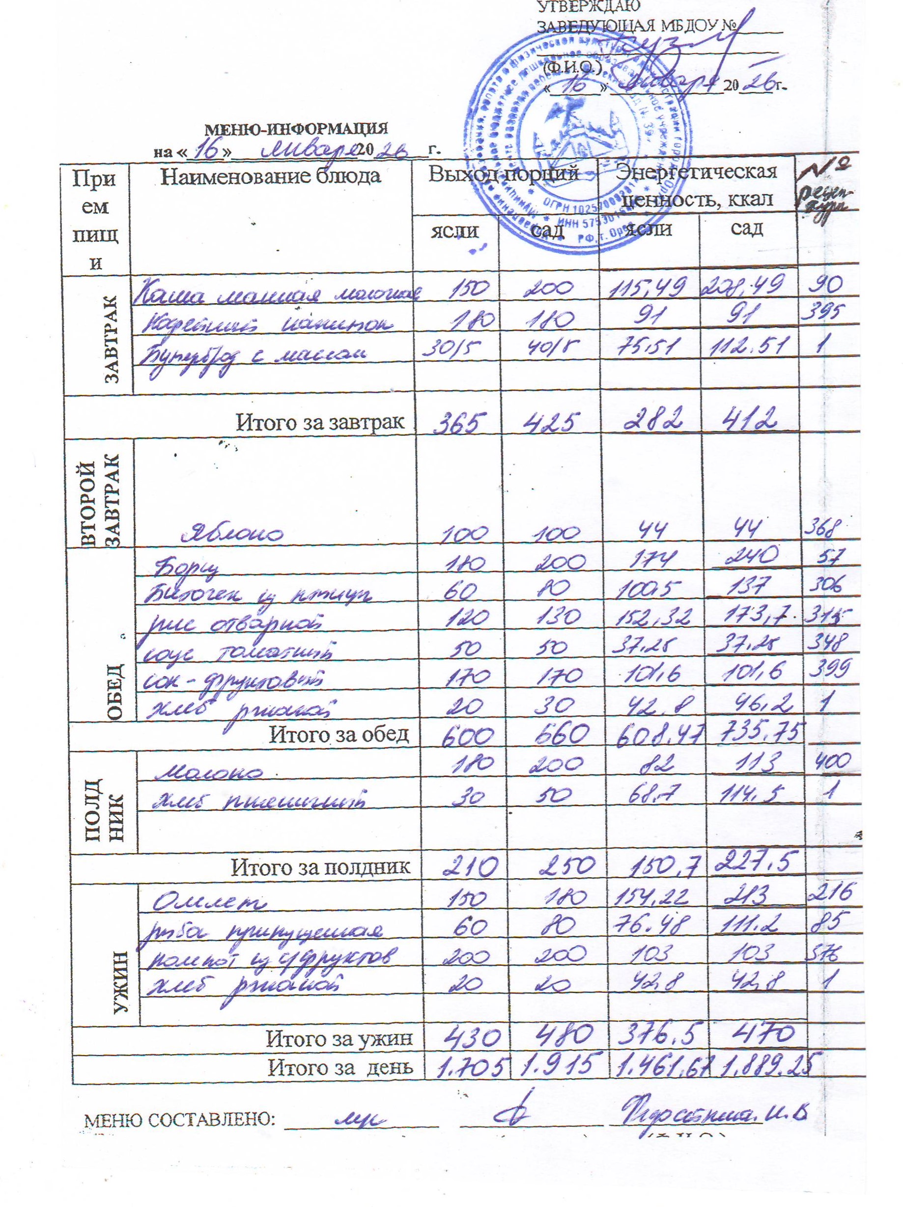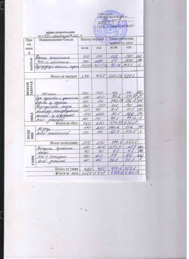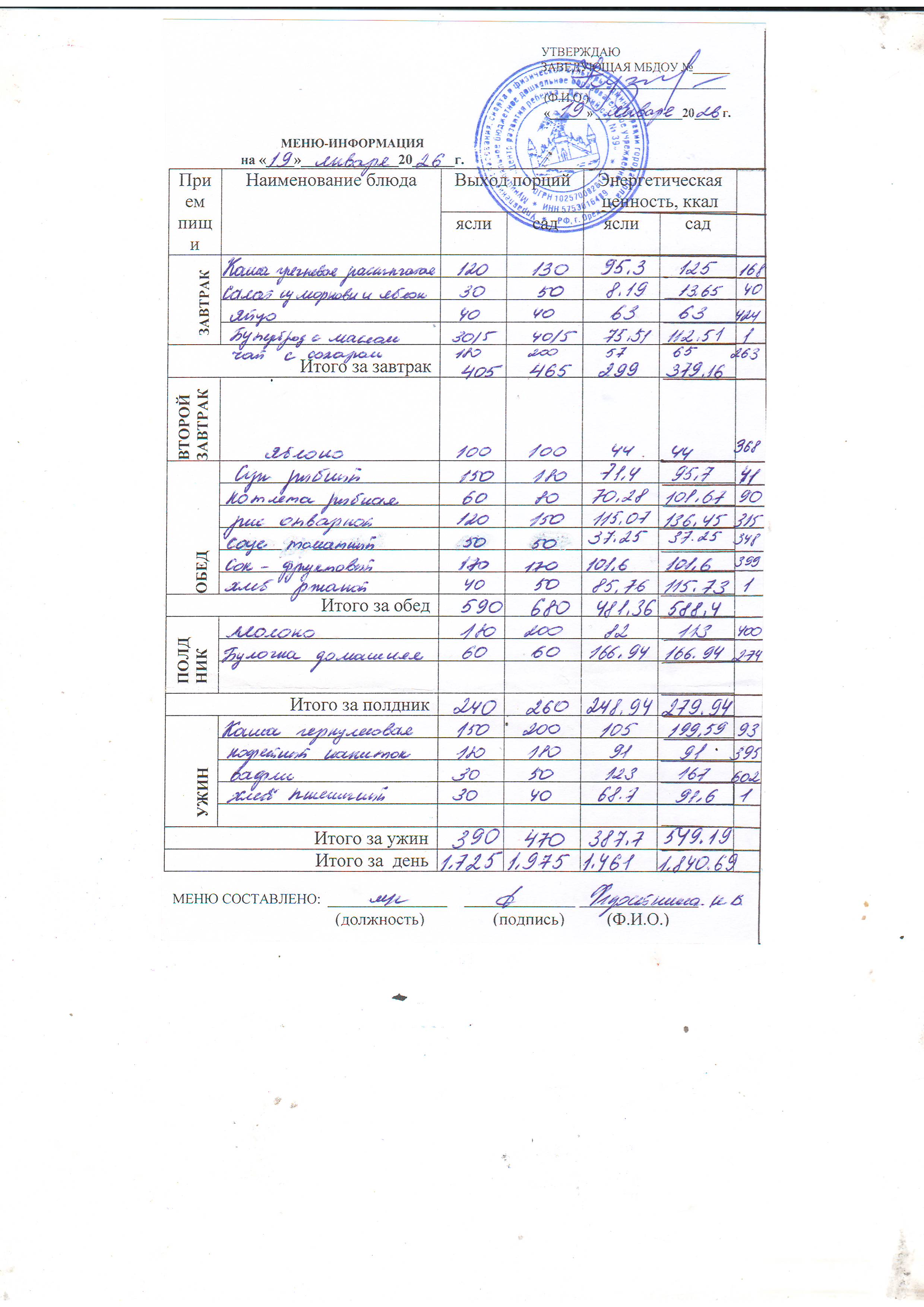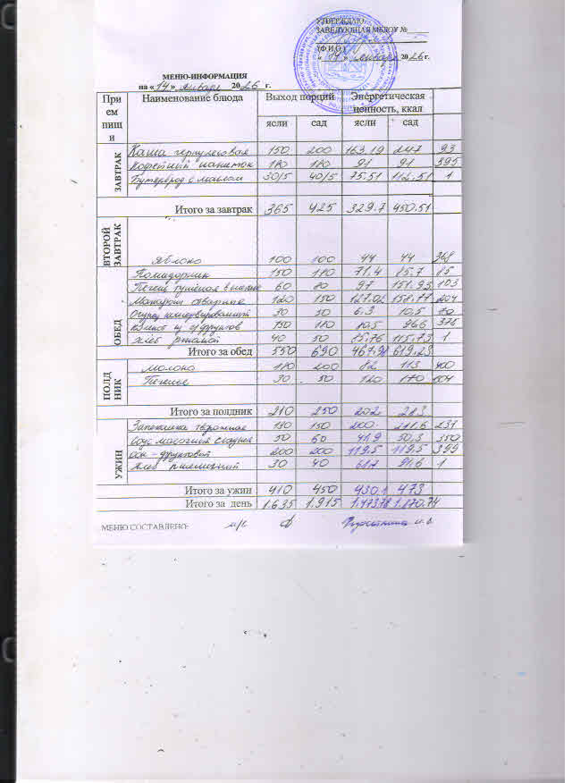 Меню предусматривает распределение блюд, кулинарных, мучных, кондитерских и хлебобулочных изделий по отдельным приемам пищи (завтрак, второй завтрак, обед, полдник, ужин). Меню разрабатываеться ДОУ и утверждается заведующей.