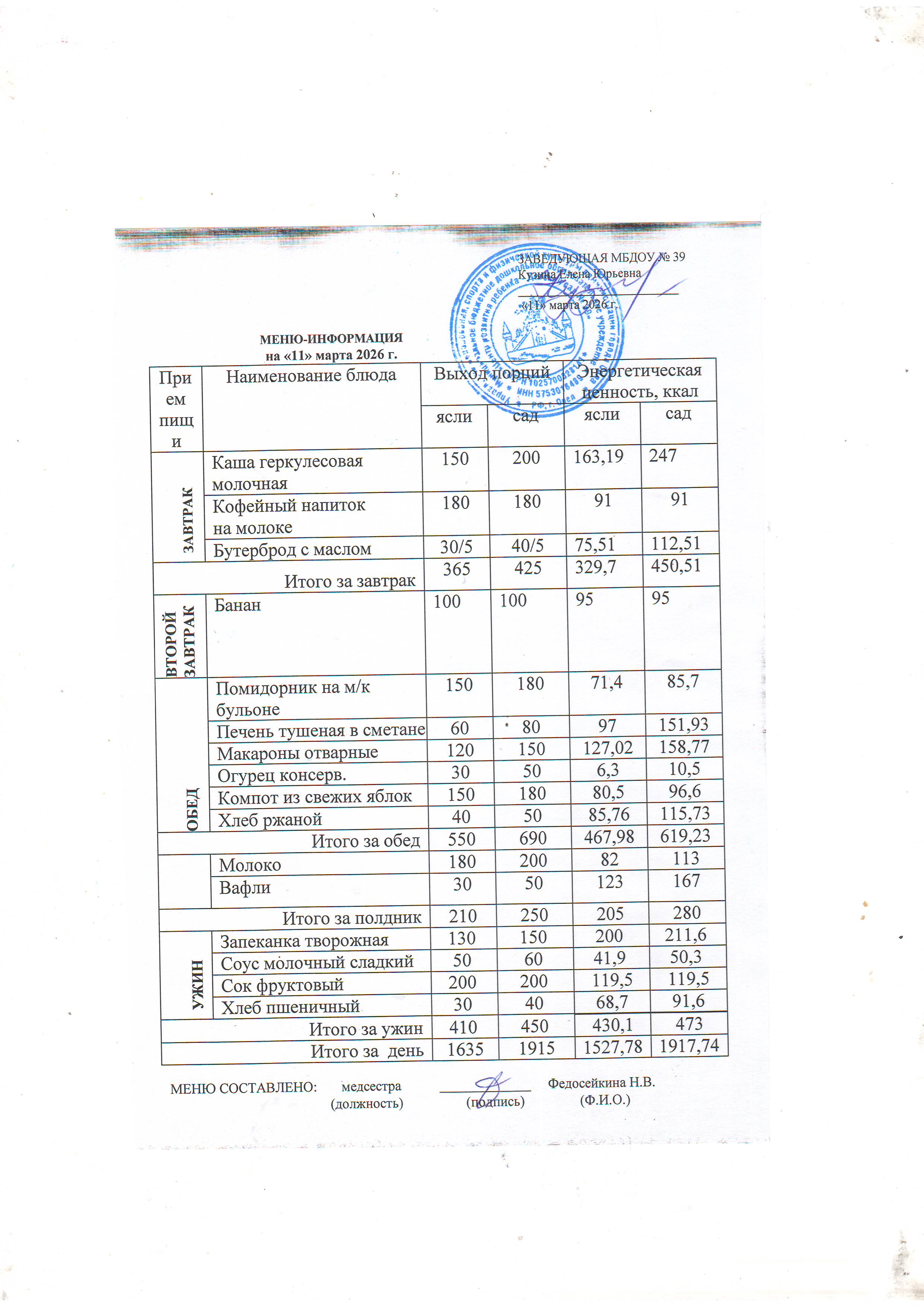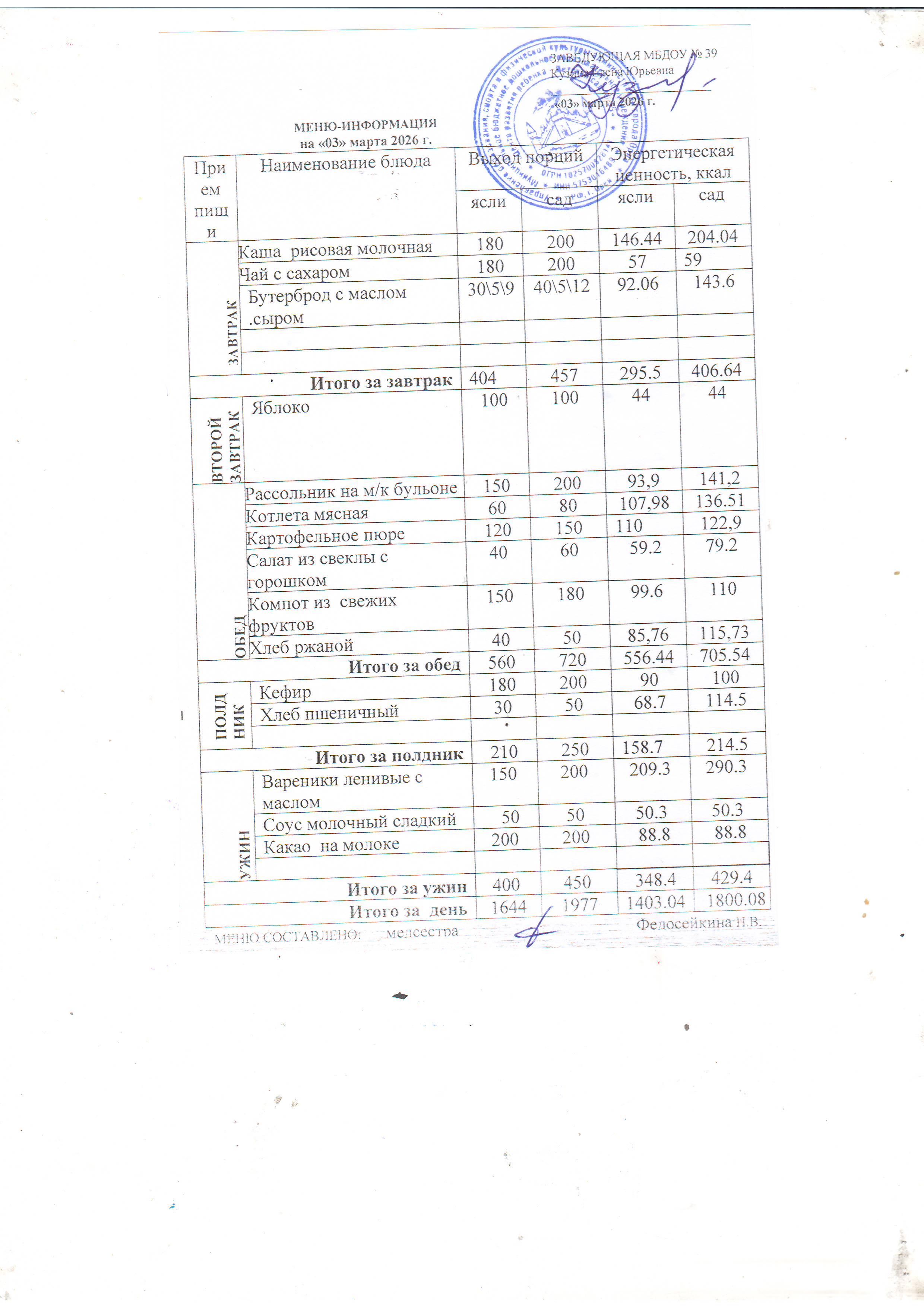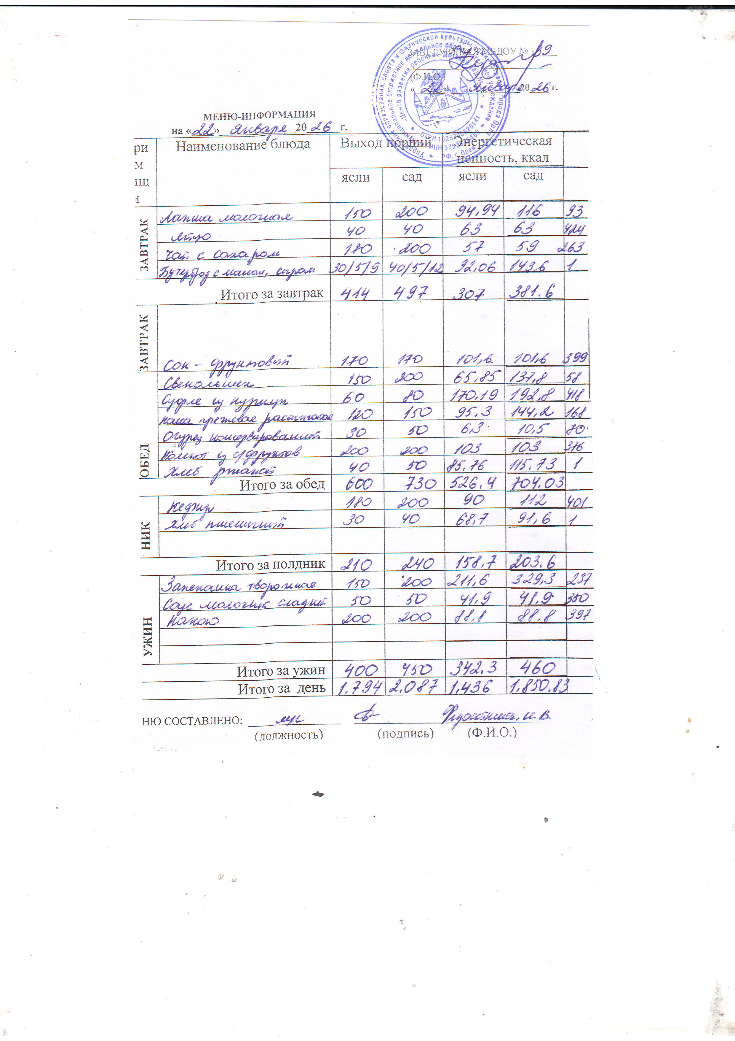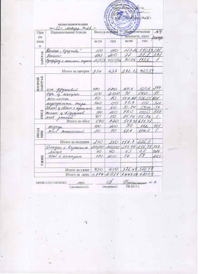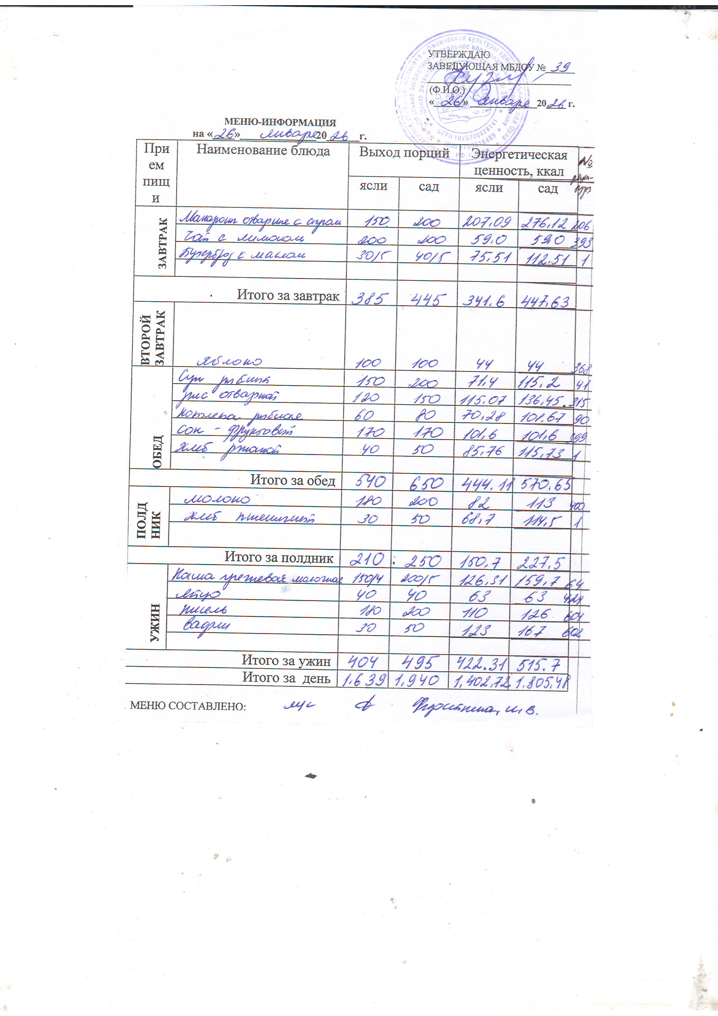 Меню предусматривает распределение блюд, кулинарных, мучных, кондитерских и хлебобулочных изделий по отдельным приемам пищи (завтрак, второй завтрак, обед, полдник, ужин). Меню разрабатываеться ДОУ и утверждается заведующей.