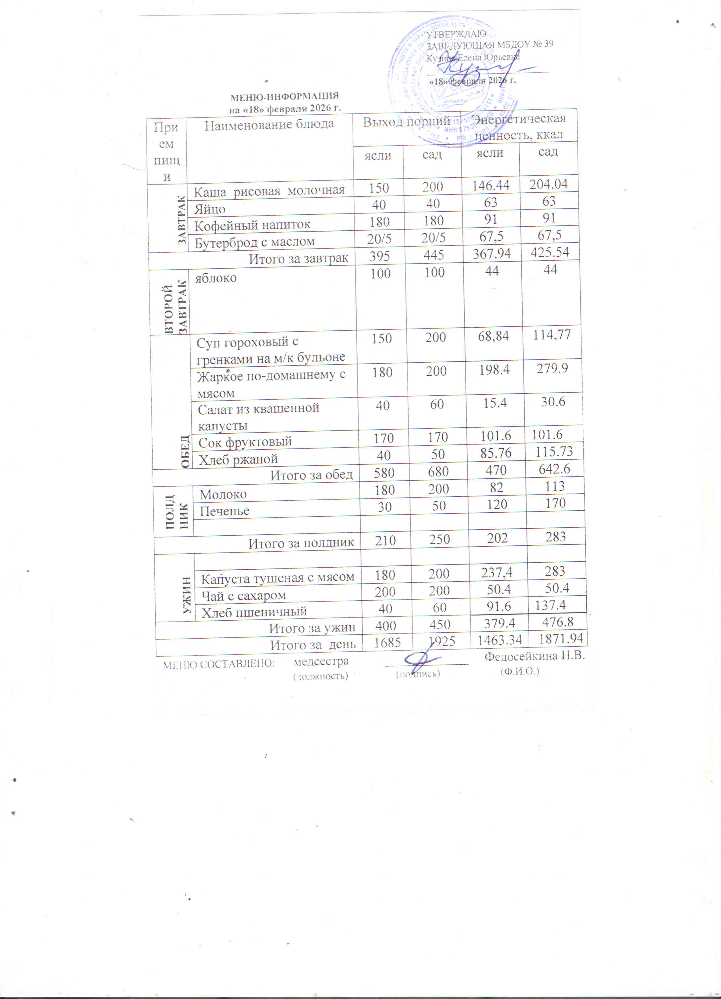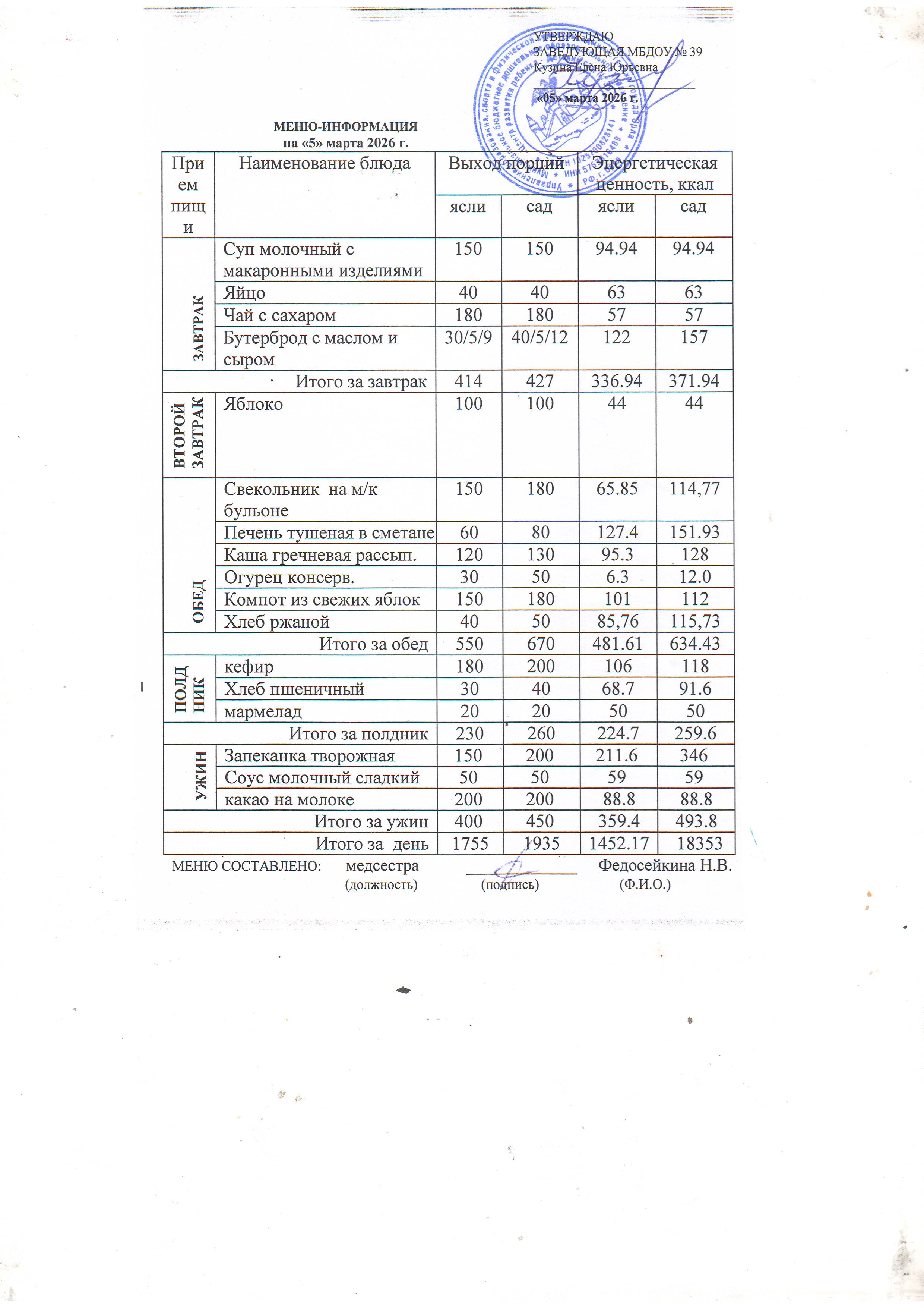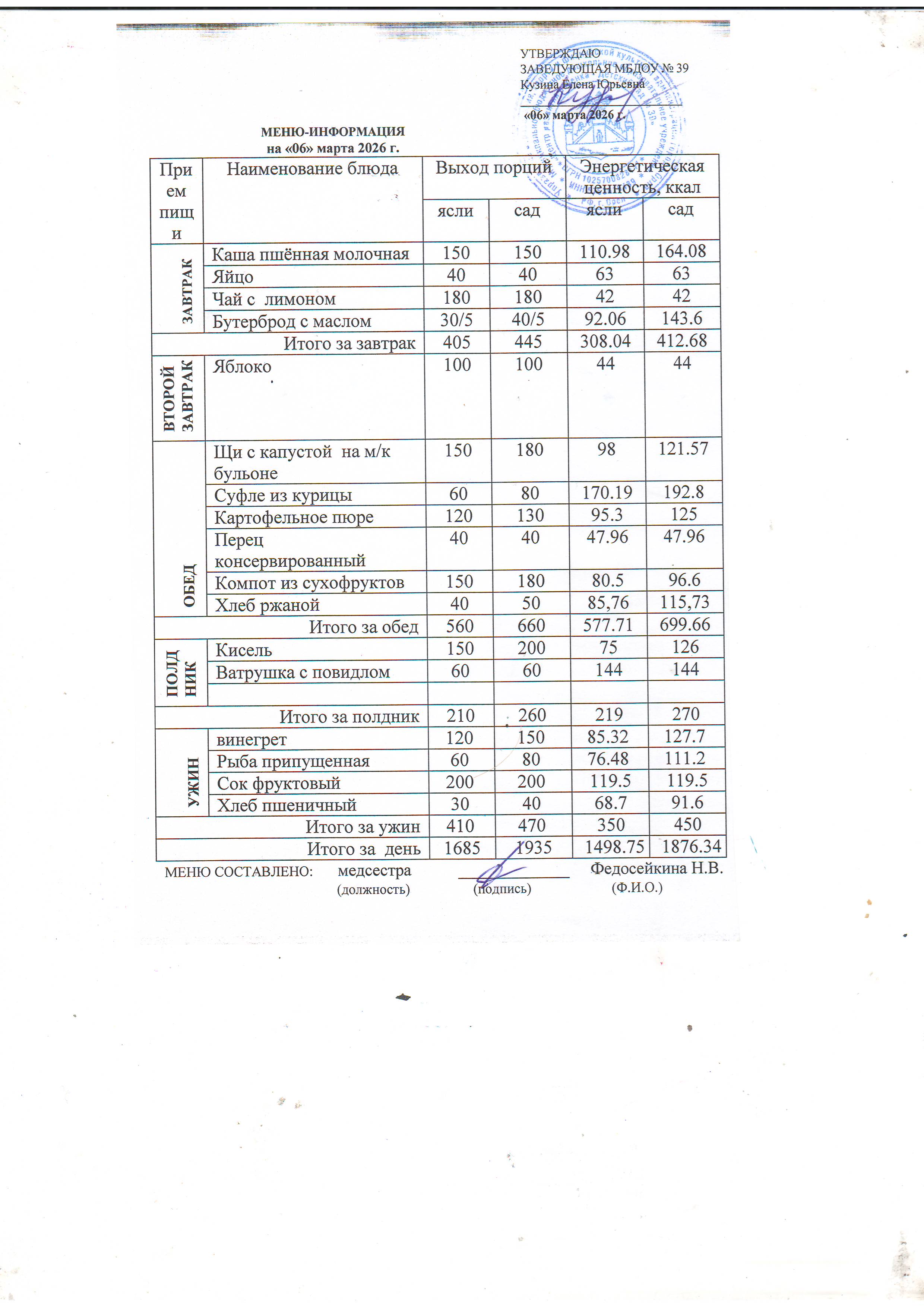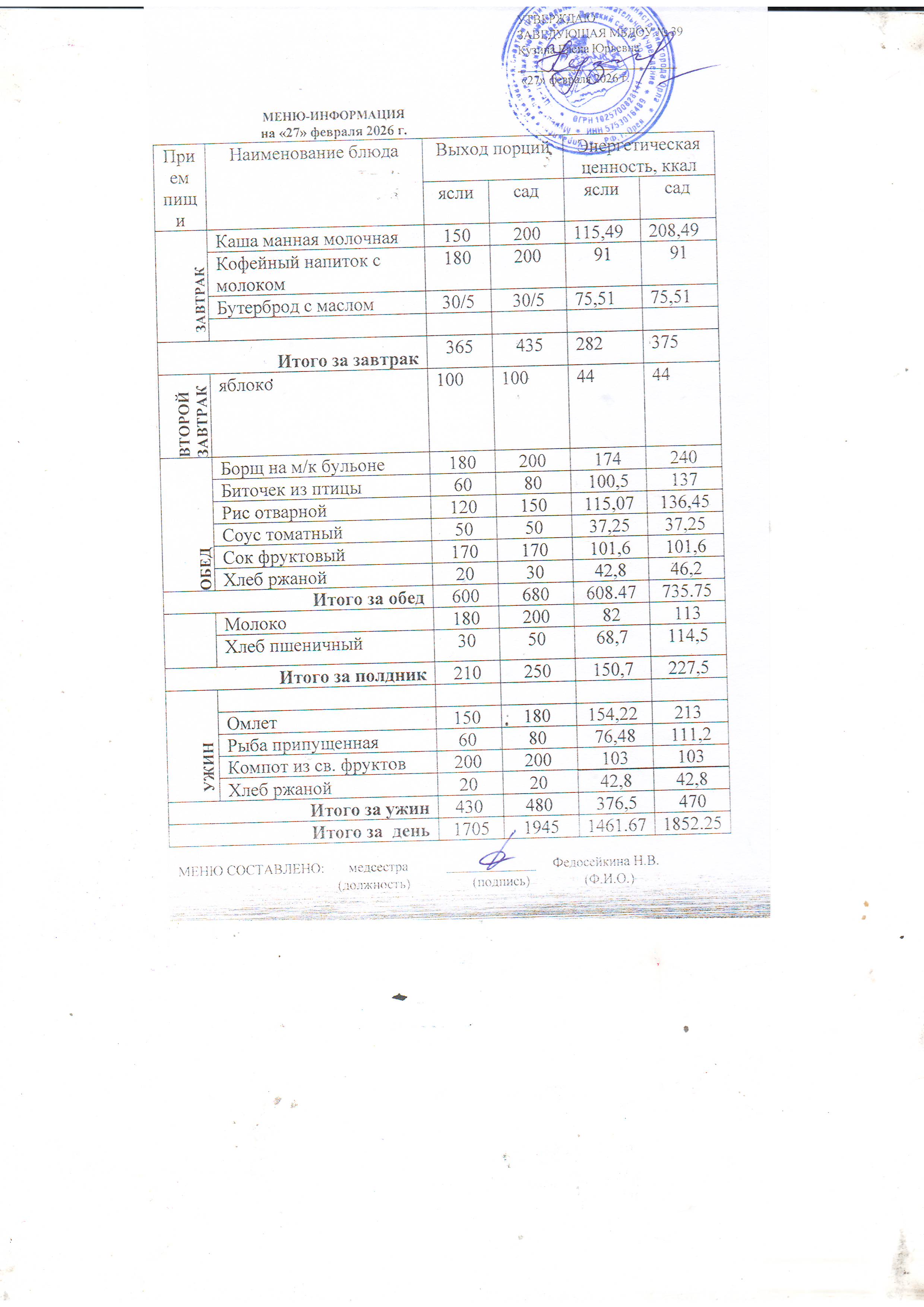 Меню предусматривает распределение блюд, кулинарных, мучных, кондитерских и хлебобулочных изделий по отдельным приемам пищи (завтрак, второй завтрак, обед, полдник, ужин). Меню разрабатываеться ДОУ и утверждается заведующей.