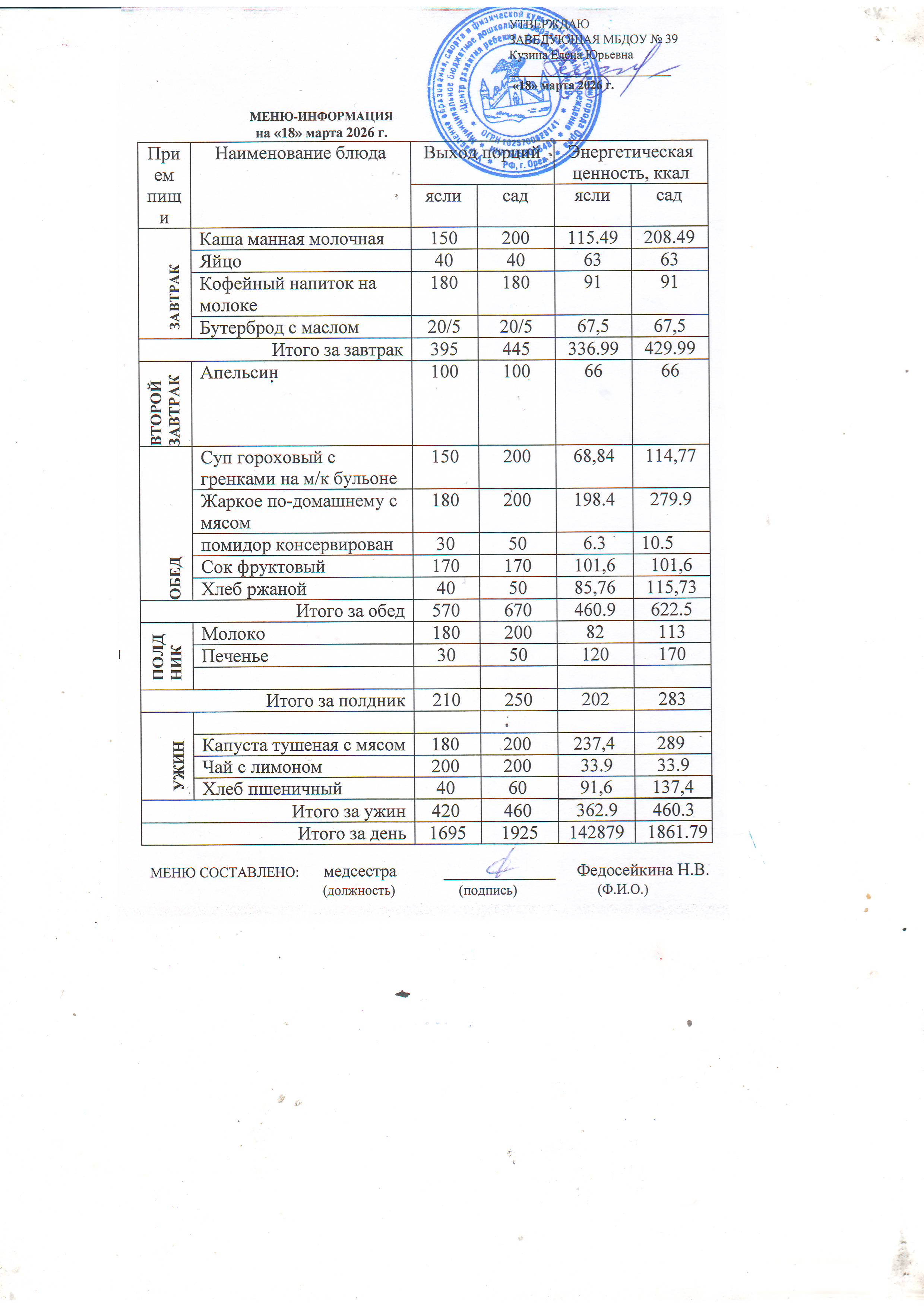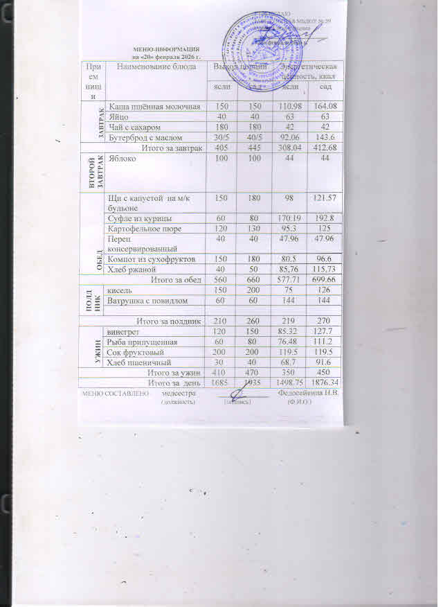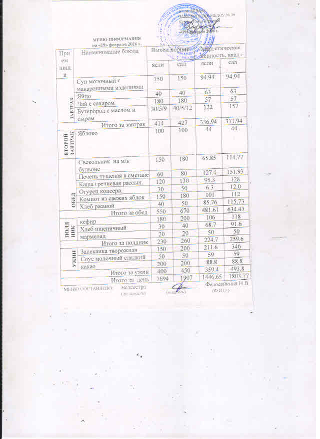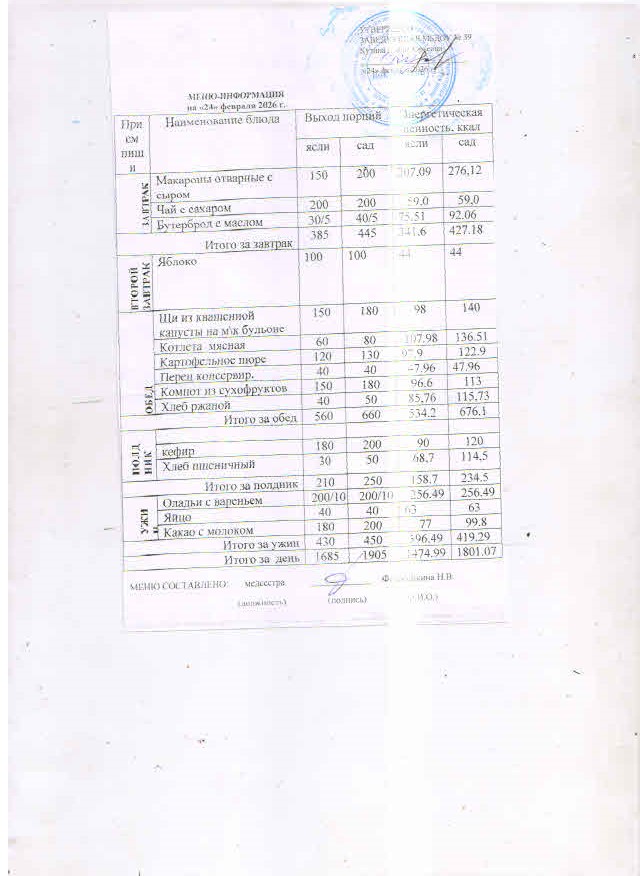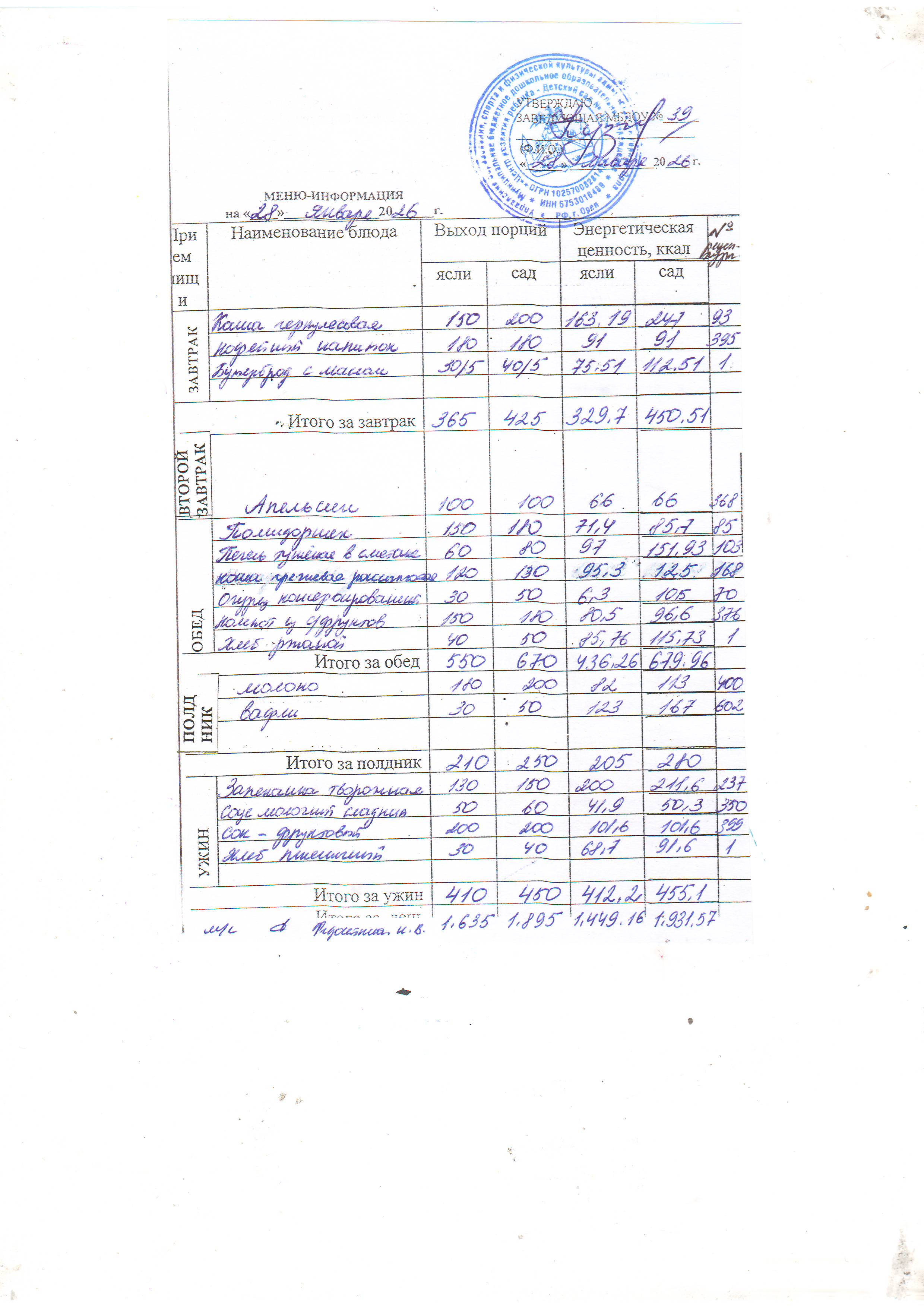 Питание детей осуществляется по десятидневному меню для детей, посещающих МБДОУ ЦРР - детский сад № 39 города Орла с 12 часовым пребыванием, в соответствии с физиологическими нормами потребления продуктов.