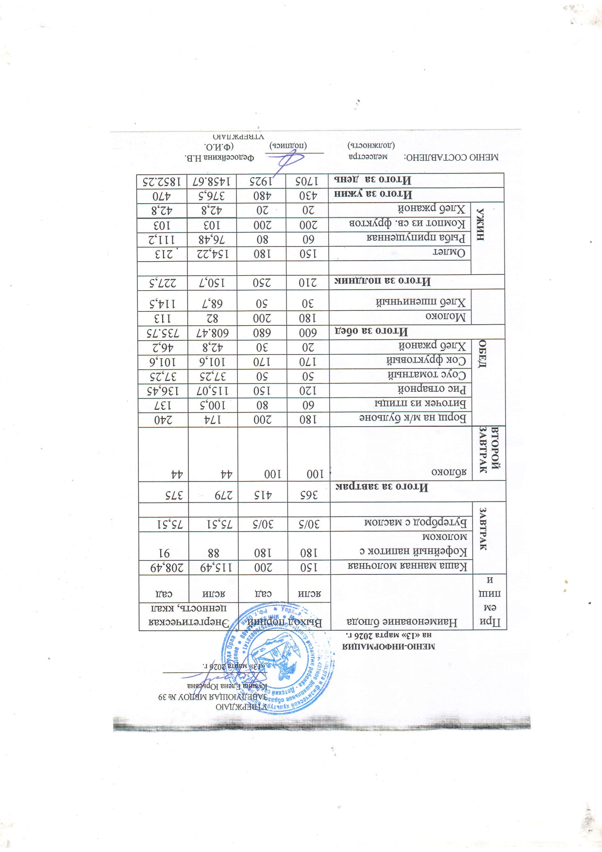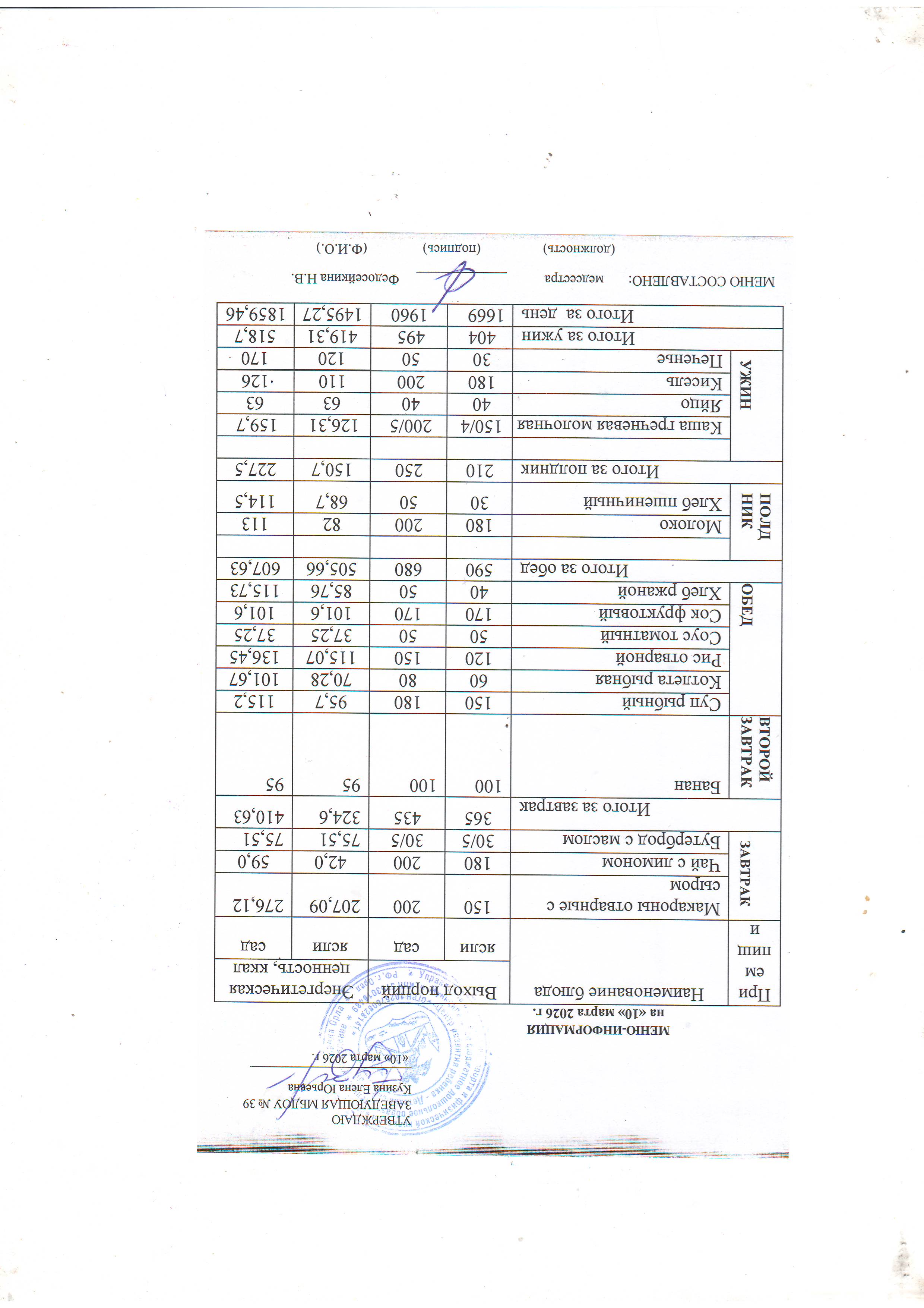 меню соответствует утверждённому 10‑дневному плану;